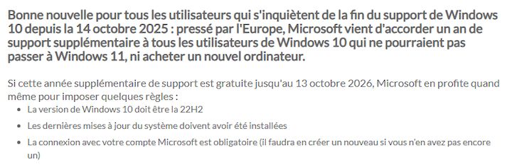 - 20.10.2025 : Windows 10 : Microsoft accode 1 an de support supplémentaire à l'Europe