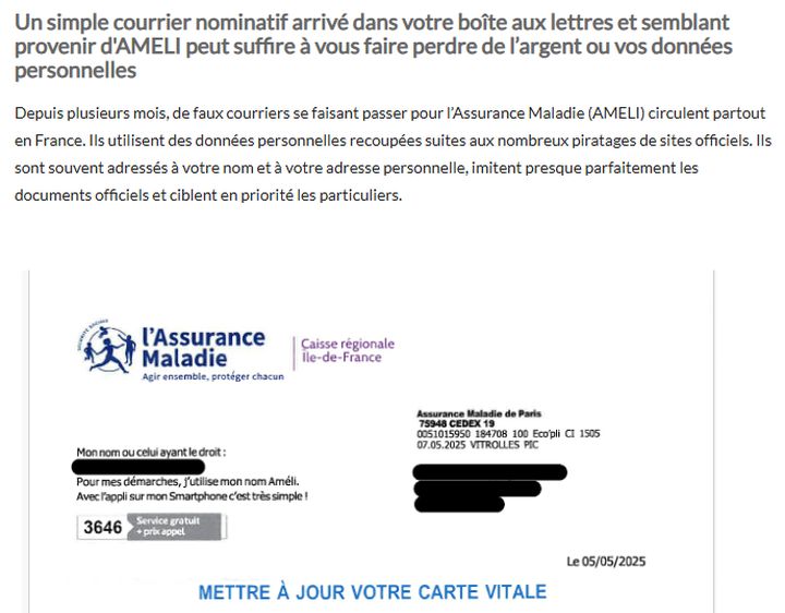- 14.01.2026 : Attention à cette arnaque AMELI qui peut arriver directement dans votre boîte aux lettres